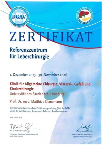 Seit Dezember 2014 ist die Klinik für Allgemeine Chirurgie, Viszeral-, Gefäß- und Kinderchirurgie am UKS auch als Zentrum für Chirurgische Erkrankungen der Leber zertifiziert. Seit Dezember 2017 nun erstmals als Referenzzentrum und im Juli 2021 und im Februar 2024 wurden wir erfolgreich rezertifiziert.