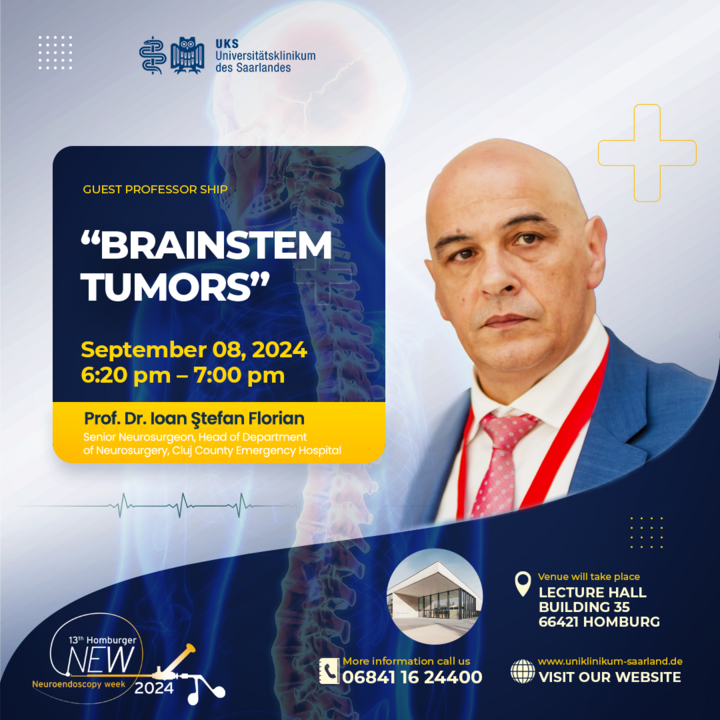 Die neurochirurgische Klinik des UKS unter Leitung von Prof. Dr. Joachim Oertel freut sich sehr, bereits den dritten Gastprofessor der Klinik für Neurochirurgie ankündigen zu dürfen. Prof. Ioan Stefan Florian wird am 8. September, von 18:20 Uhr bis 19:00 Uhr einen Vortrag über „Brainstem Tumors“ im Hörsaalgebäude (Geb. 35) halten. Alle Interessierten sind herzlich willkommen und die Klinik würde sich freuen, zahlreiche Zuhörer begrüßen zu dürfen.