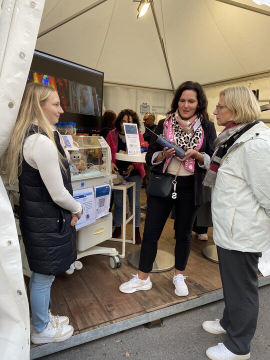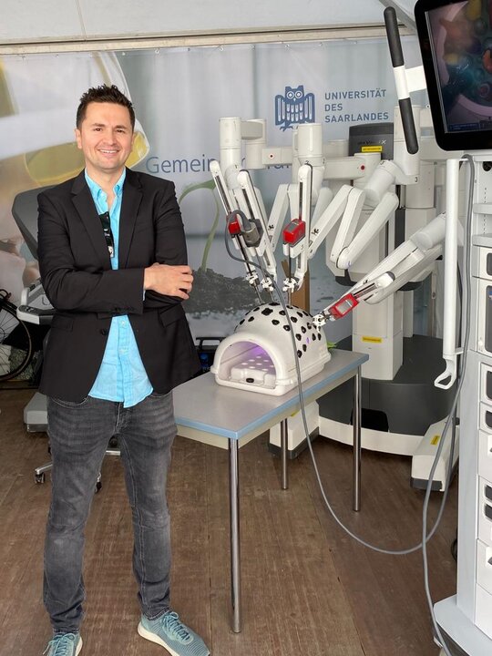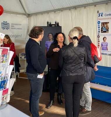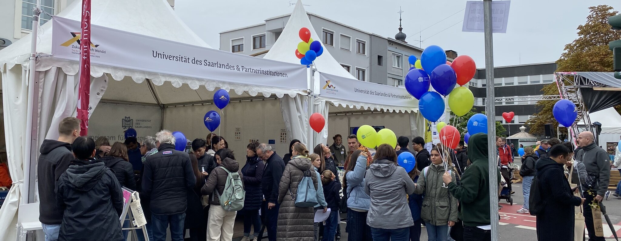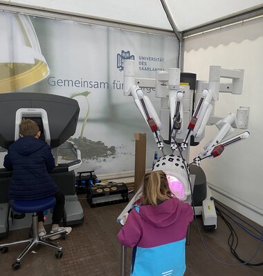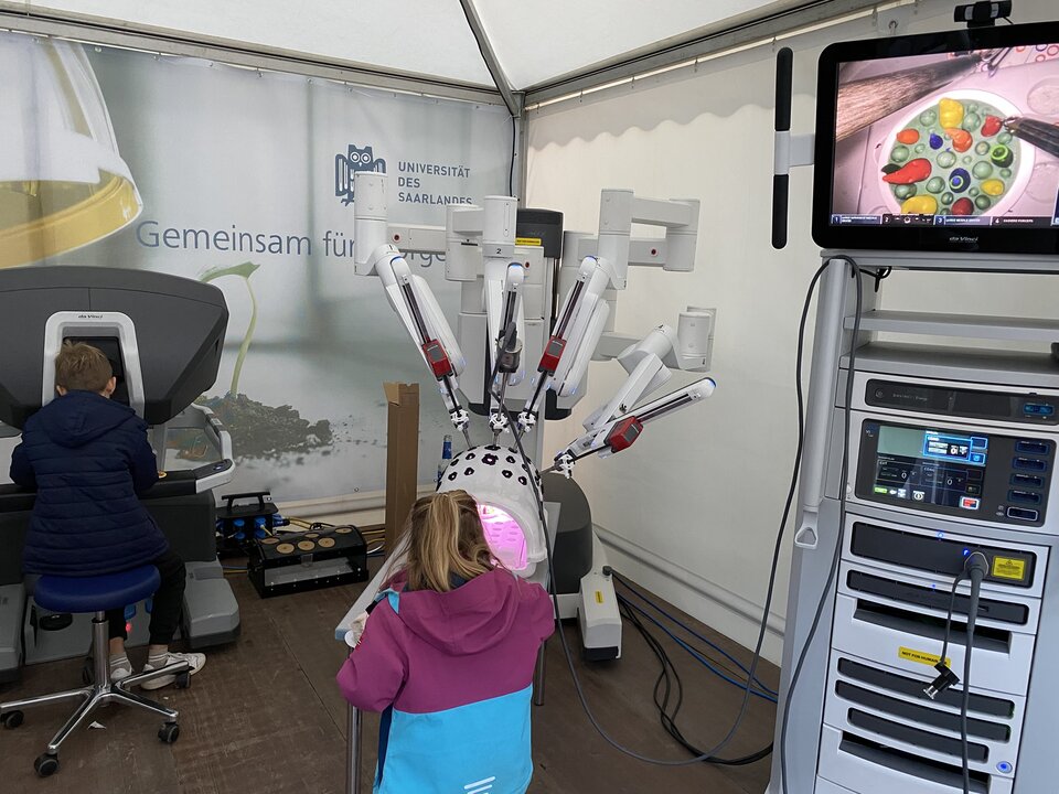 Das UKS war vom 2. bis 4. Oktober 2025 beim großen Bürgerfest zum Tag der Deutschen Einheit in Saarbrücken mit dabei. Organisiert von der Universität des Saarlandes gab es einen gemeinschaftlichen Stand auf der „Zukunft durch Wandel-Meile“ und Mitmach-Angebote für Kinder auf der „Mini MINT-Meile“. An beiden Stellen waren verteilt über die drei Veranstaltungstage Kolleginnen und Kollegen des UKS und der Medizinischen Fakultät mit spannenden Themen zu finden, u.a. waren das: Unsere Kliniken für Urologie, Allgemeinchirurgie und Frauenheilkunde, die den Operations-Roboter daVinci® ausgestellt haben – jeder konnte vorbeikommen und sich selbst als Operateurin oder Operateur ausprobieren. Auch das UKS-Schulzentrum war vor Ort und hat über die Ausbildungsangebote am UKS informiert. Unsere Kinderklinik präsentierte das Forschungsprojekt „empathischer Inkubator“. Die Klinik für Kinder- und Jugendpsychiatrie bot ein Trainingsspiel gegen Mobbing. Das Centrum für geschlechtsspezifische Biologie und Medizin (CGBM) stellte sich vor und der Verein FIRST AID students e.V. zeigte den jungen Besucherinnen und Besuchern, wie man spielend leicht Reanimation lernt.