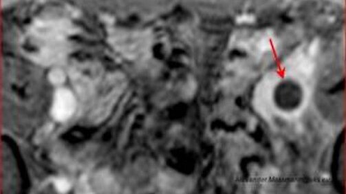 Die röntgenstrahlenfreie Magnetresonanztomografie (MRT) des Beckens zeigt die mit einem Pfeil markierte spitz zulaufende Thrombose (schwarze schnabelförmige Struktur) in der Beckenvene bedingt durch eine zugrundeliegende Beckenvenenkompression (May-Thurner).
