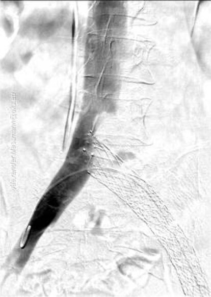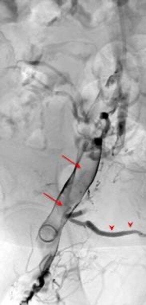 Bei einer Beckenvenenthrombose oder TVT sind tiefe Venen verschlossen. In der Folge kann es zu einem Ulcus cruris („offenes Bein“) kommen. Mit Hilfe der Interventionellen Radiologie können wir den Blutfluss in den betroffenen Venen wiederherstellen, ohne dass ein chirurgischer Schnitt nötig ist.