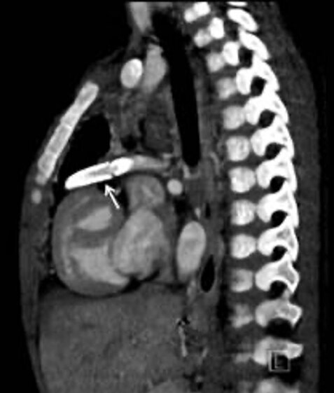 Sagittale Rekonstruktion mit operativ angelegtem Bypass (Pfeile) zwischen dem rechten Ventrikel und der Pulmonalarterie. Strahlenbelastung von 0,9 mSv.