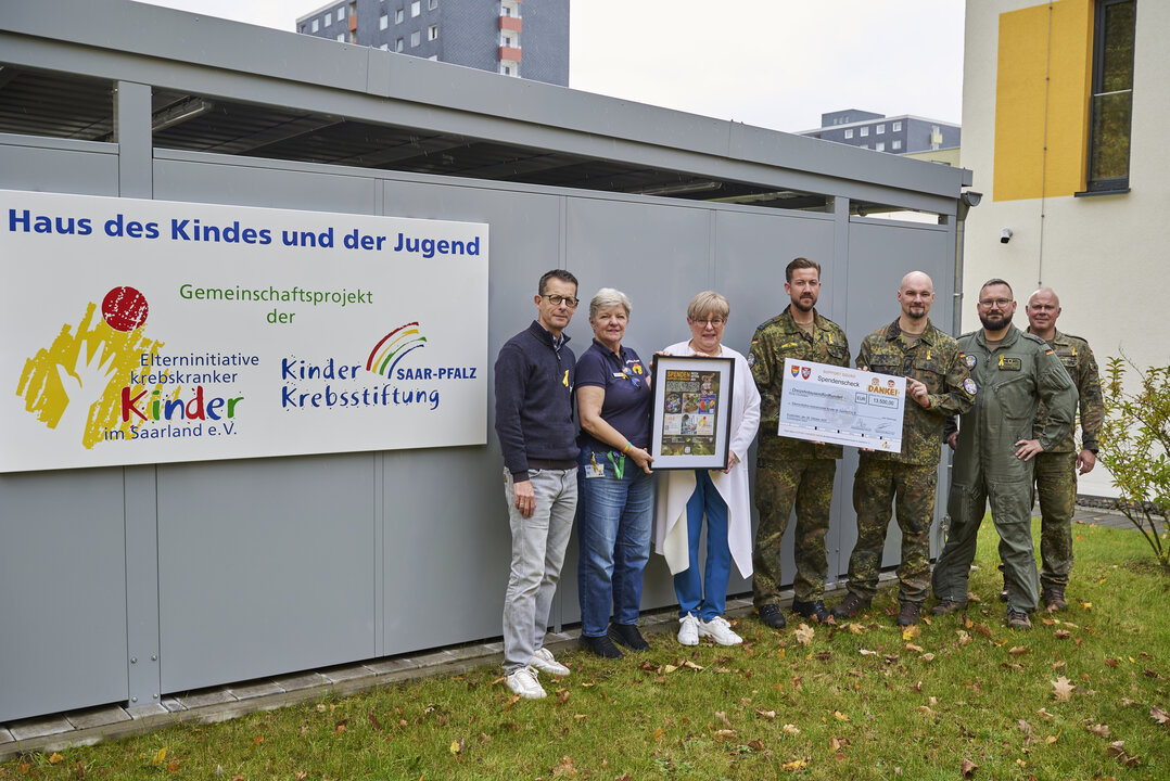 Es war ein ungewohntes Bild im Haus des Kindes und der Jugend: Uniformen in Flecktarn, olivfarbener Piloten-Anzug – die Bundeswehr war zu Besuch und hatte einen Spendenscheck über 13.500 Euro für die Elterninitiative krebskranker Kinder im Saarland e.V. im Gepäck.