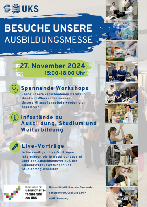 Am Mittwoch, 27. November, lädt das Schulzentrum des Universitätsklinikums des Saarlandes (UKS) zur Ausbildungsmesse auf den Homburger Campus ein. Von 15 bis 18 Uhr können sich Schülerinnen und Schüler sowie alle Interessierten in den Gebäuden 53 und 54 umfassend über das Ausbildungsangebot am Universitätsklinikum informieren. Das UKS ist mit rund 800 Ausbildungsplätzen das größte Ausbildungszentrum in der Region und präsentiert eine breite Palette spannender und zukunftssicherer Ausbildungsgänge in verschiedenen Gesundheitsfachberufen.