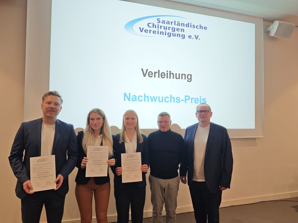 Mit jeweils 100 Euro dotierte Posterpreise für die Darstellung ihrer Forschungsprojekte erhielten Dr. Laura-Kim Feiner aus dem Forschungslabor der Klinik für Allgemeine Chirurgie (Direktor: Prof. Dr. Matthias Glanemann), sowie Dr. med. Sebastian Schreiber aus der Unfallchirurgie (Direktor: Prof. Dr. Emmanouil Liodakis) mit ihren Teams.