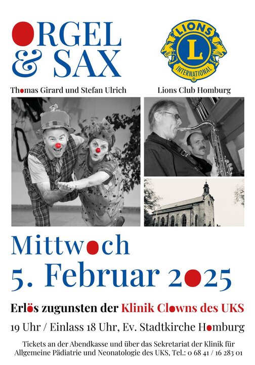 Am Mittwoch, 5. Februar 2025, spielt das Duo „Orgel & Sax“ in der Evangelischen Stadtkirche in Homburg ein Benefizkonzert für die Klinikclowns des Universitätsklinikums des Saarlandes (UKS). Die vom Lions Club Homburg organisierte Veranstaltung beginnt um 19 Uhr, der Einlass startet um 18 Uhr. Tickets für das Konzert sind zum Preis von 10 Euro im Vorverkauf über die UKS-Kinderklinik und nach Verfügbarkeit an der Abendkasse erhältlich.
