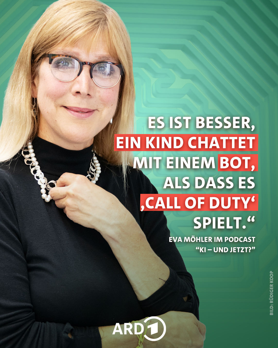 Besser eine Stunde mit dem Chatbot schreiben als eine Stunde Call of Duty spielen: Das sagt Kinder- und Jugendpsychiaterin Prof. Dr. Eva Möhler vom Universitätsklinikum des Saarlandes. ARD-Journalistin Simin Sadeghi und KI-Experte Aljoscha Burchardt (DFKI) sprechen im Podcast „KI und jetzt?“ mit ihr auch über die Chancen von Bots.