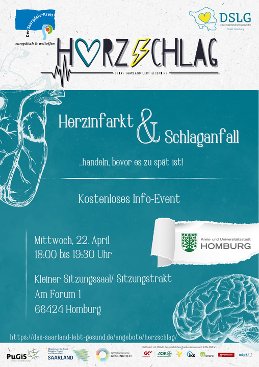 Die HerzSchlag-Kampagne kommt erneut in den Saarpfalz-Kreis. Die Infoveranstaltung findet am Mittwoch, 22. April, von 18 bis 19.30 Uhr im Sitzungstrakt im Homburger Rathaus Am Forum statt. Die Teilnahme an der Veranstaltung ist kostenfrei. Veranstalter ist der Verein Prävention und Gesundheit im Saarland (Pugis e. V.), der die HerzSchlag-Kampagne im Rahmen von „Das Saarland lebt gesund“ durchführt.